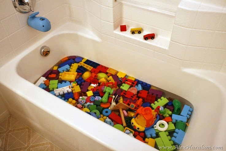 Then I dumped in all the water safe toys. You know the plastic Duplos, kitchen play toys, matchbox cars, and even the wood stuff. But they only went in and out quickly. Don’t put anything in there with batteries or holes that water can get in and possibly never get back out again.